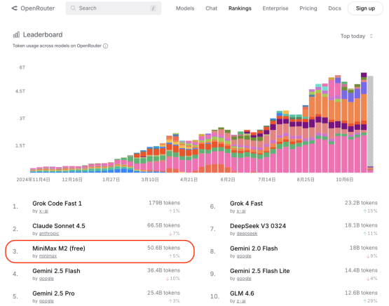 >2025 年 10 月至今,MiniMax 又发布了 M2 和 M2.1 两个文本生成模型,通过出色的预训练能力,使得两款模型在多项开源模型测试中都取得了第一名的好成绩,其中后者更是在 OpenRouter AI 聚合平台中成为了使用量最多的国内模型,展现出了其在 AI 社区中出色的口碑。