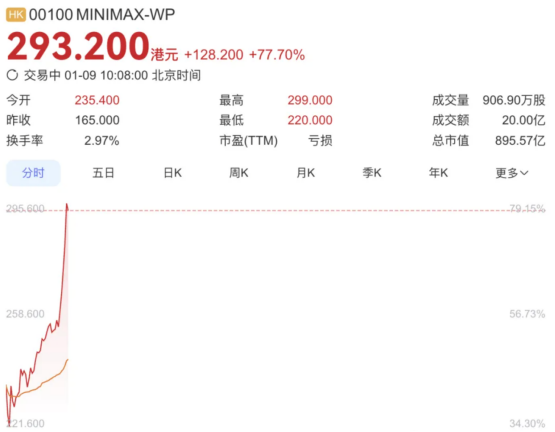 如果按照申购数量来计算的话,那么国际投资机构总共申购了实际配额的>37 倍,普通股民则申购了实际可卖数量的 1837 倍,当天股价最高时相比发行价甚至达到了 180%,尽管收盘时股价回落到发行价的 160%,但最终依然成为了全球首家市值超 1000 亿港元的 AI 大模型公司。>不得不说 MiniMax 这堪称狂飙的开盘表现算是非常优秀,同时这次上市也为 MiniMax 在二级市场的首秀储备了极为丰富的弹药,让 MiniMax 未来的股价充满了想象空间。